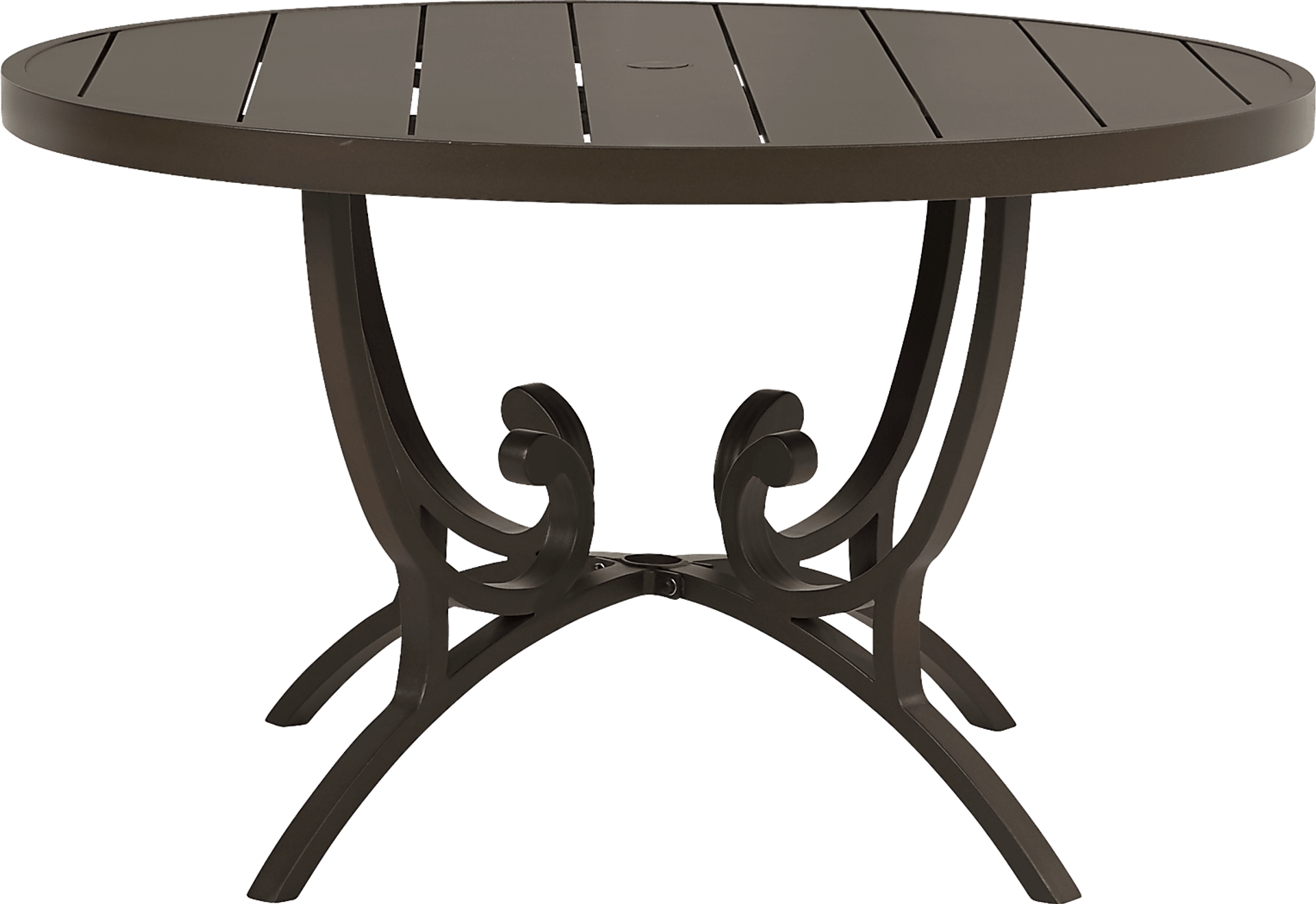 Be ready for outdoor parties and meals with the stylish and durable Lake Breeze dining table. This 48 inch round table has a plank style top supported by a decorative scrolled base, while the aluminum frame is rendered in a decorator friendly aged bronze finish in a rust resistant all-weather powder coat finish using a UV protected top coat. A hole in the center gives you the option to add an umbrella (sold separately) for shade.