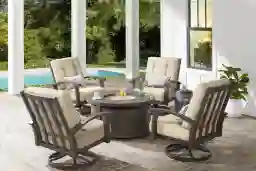 Lake Breeze Aged Bronze 5 Pc Outdoor Fire Pit Seating Set With Swivel Chairs And Hemp Cushions