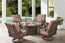 Lake Breeze Aged Bronze 5 Pc Outdoor Fire Pit Seating Set With Swivel Chairs And Terracotta Cushions