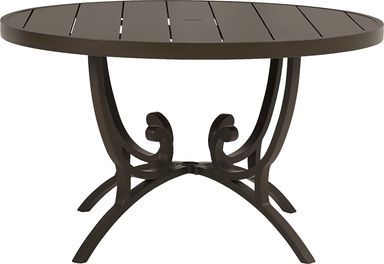 You'll always be prepared for outdoor parties with the stylish and durable Lake Breeze dining table. The 78 inch oval table has a plank style top supported by a decorative scrolled trestle base while, the aluminum frame is rendered in a decorator friendly aged bronze finish in a rust resistant all-weather powder coat finish using a UV protected top coat. A hole in the center gives you the option to add an umbrella (sold separately) for shade.