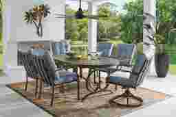 Make the most of beautiful weather with the stylish and durable Lake Breeze dining set. This inviting collection features a table with a 78-inch oval plank style top supported by a decorative scrolled trestle base, while the aluminum frame is rendered in an aged bronze finish with a rust resistant all-weather powder coat using a UV protected top coat. An umbrella hole in the center of the table can be capped when not in use. Coordinating chairs feature matching frames with blueberry-colored cushions upholstered in outdoor performance fabric for exceptional durability and color retention. Select colors available in Sunbrella outdoor fabric.