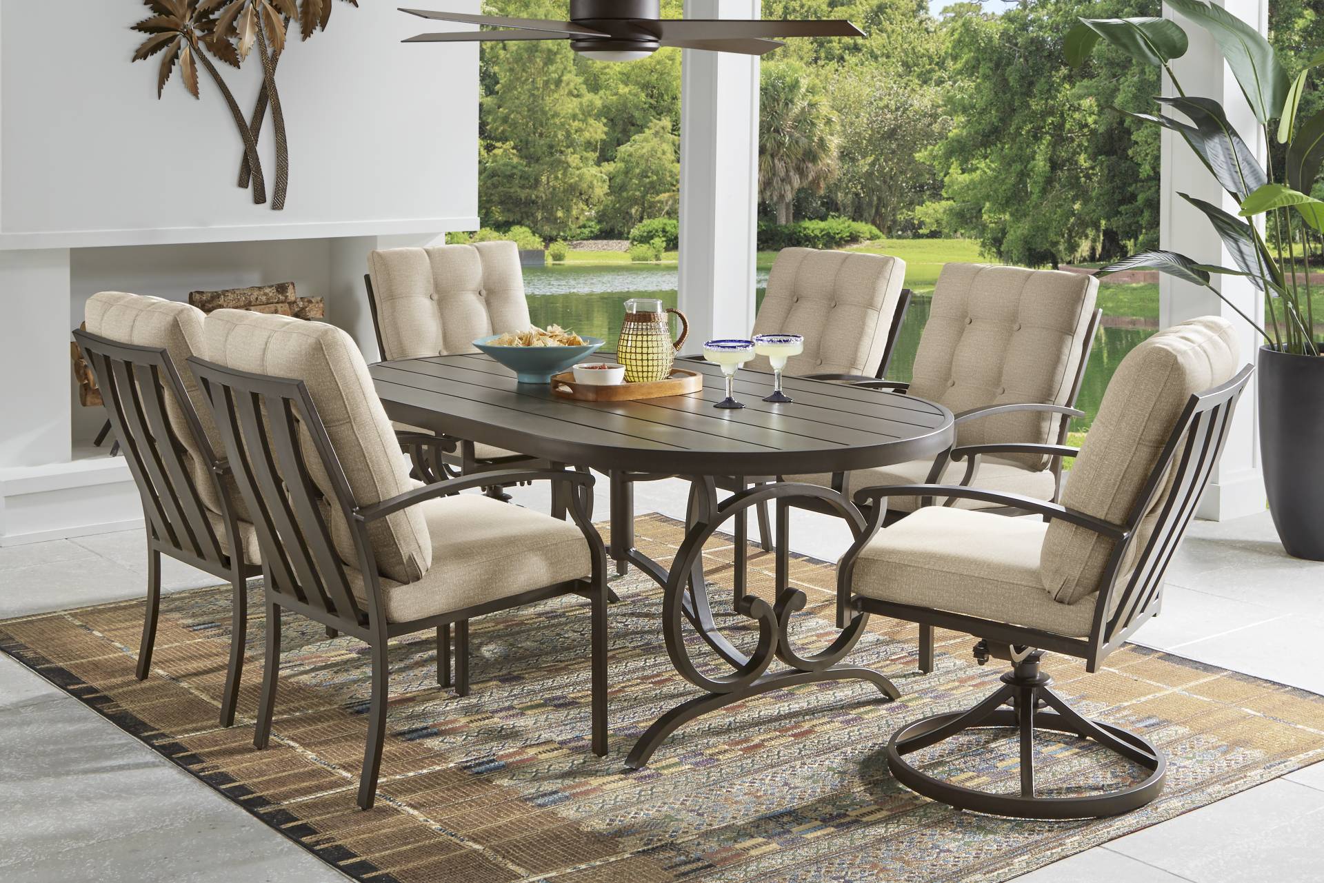 Lake Breeze Aged Bronze 7 Pc Oval Outdoor Dining Set With Hemp-colored Cushions
