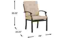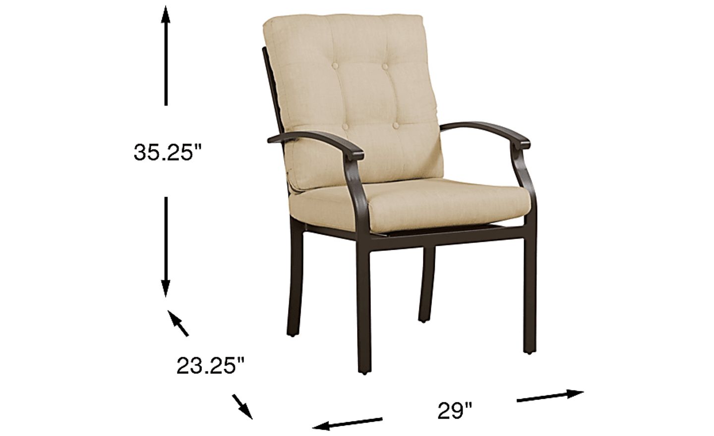 Perfect for outdoor dining under the sun or stars, the Lake Breeze dining chair easily balances comfort and durability. It's made with an aluminum frame in a rust resistant all-weather powder coat finish using a hand applied aged bronze finished UV protected top coat. Sunbrella performance fabric covered cushions, in a straw color, are colorfast, mold and mildew resistant for durable outdoor use. Design details include a slat back, straight arms, button tufted back cushions and French seaming on the seat cushion. 100% Sunbrella fabric. To clean Sunbrella fabric cushions remove dirt and spray on cleaning solution (water and mild soap), then use a soft bristle brush or sponge. Allow cleaning solution to soak into fabric and rinse thoroughly until soap residue is removed. Air dry. Do not dry clean.