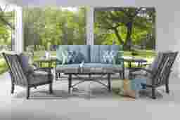 Make your backyard an inviting destination with the Lake Breeze seating set. This cozy outdoor collection features slat back styling and is made with an aluminum frame in a rust resistant all-weather powder coat finish using a hand applied aged bronze finished UV protected top coat. Blueberry-colored cushions resist fading and are mold and mildew resistant, creating long lasting and comfortable outdoor seating. Designer style accent pillows and button tufting details on the back cushions add decorative flair. Select colors available in Sunbrella outdoor fabric.
