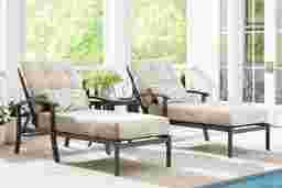 Take your style outside with the decorative and durable Lake Breeze collection. This set of two chaises easily balances comfort and durability with rust-resistant aluminum frames finished in an aged bronze. Cushions upholstered in a desert beige outdoor fabric are resistant to mold and UV rays for lasting enjoyment. Thoughtful details include adjustable seat backs, 4-button tufted back cushions and French seams on each seat cushion.