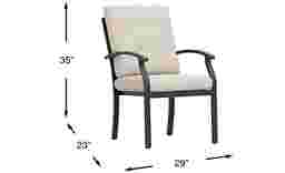 This chair balances a sleek, modern track arm and slat-back design with plush, traditional comfort. The back cushions feature sophisticated button tufting for added support, while the seat cushions are finished with tailored French seaming. At nearly 29 inches wide, the chair offers a generous seating area that provides a relaxed dining experience, making it suitable for long meals under the sun or stars.
