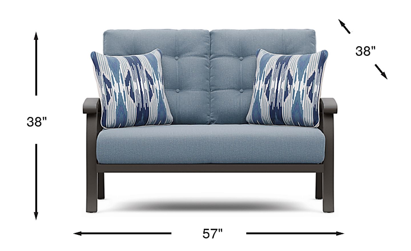 Take your style outside with the decorative and durable Lake Breeze collection. This loveseat has room for two thanks to twin back cushions with tufted button detailing and a long cozy seat cushion with French seams. Its blueberry colored outdoor fabric resists fading, mold and mildew for long-lasting durability. Additional longevity is provided by the slat-back aluminum frame in a rust resistant powder coat using a UV-protected top coat in an aged bronze finish.