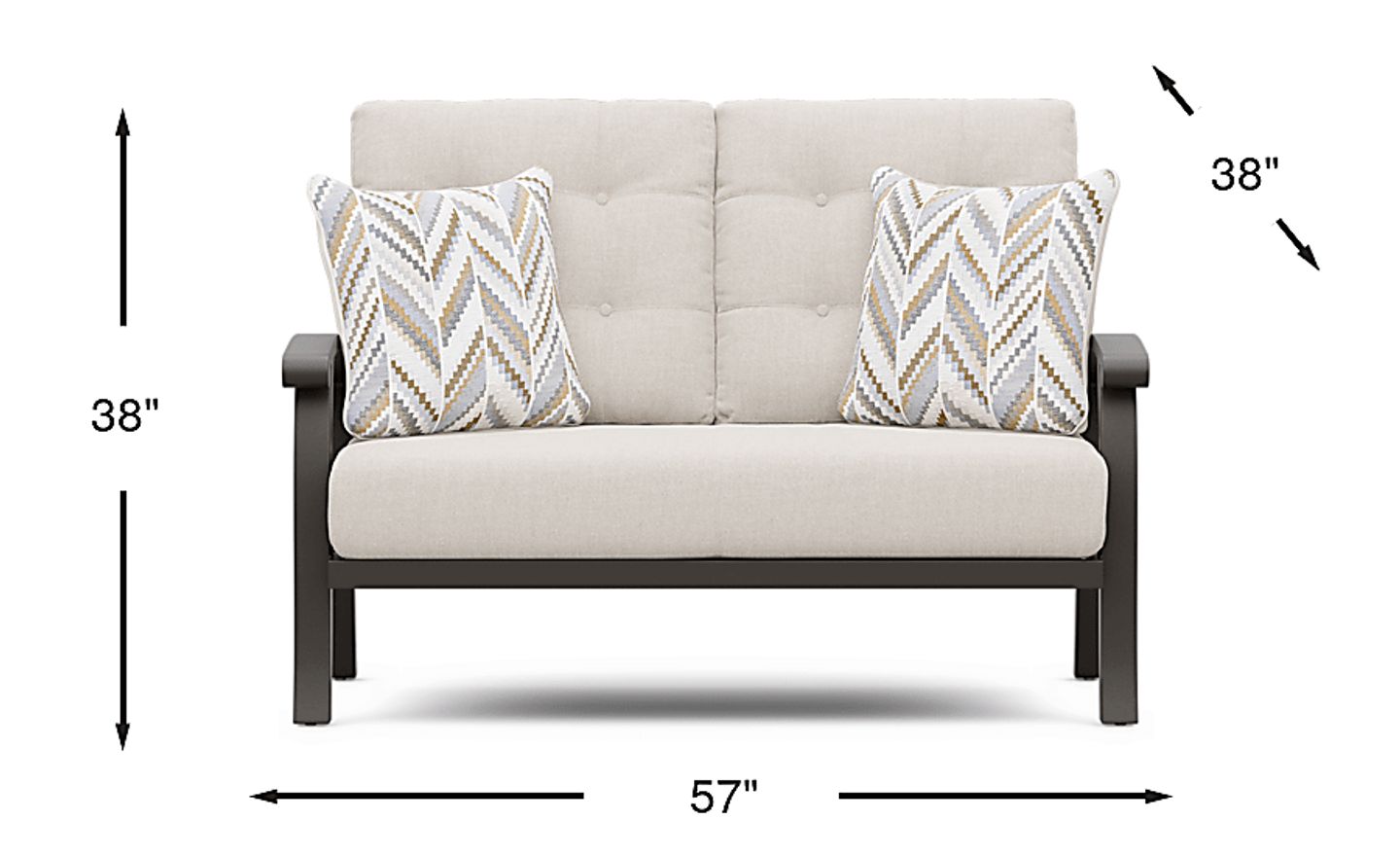Take your style outside with the decorative and durable Lake Breeze collection. This loveseat has room for two thanks to twin back cushions with tufted button detailing and a long cozy seat cushion with French seams. Its desert beige outdoor fabric resists fading, mold and mildew for long-lasting durability. Additional longevity is provided by the slat-back aluminum frame in a rust resistant powder coat using a UV-protected top coat in an aged bronze finish.