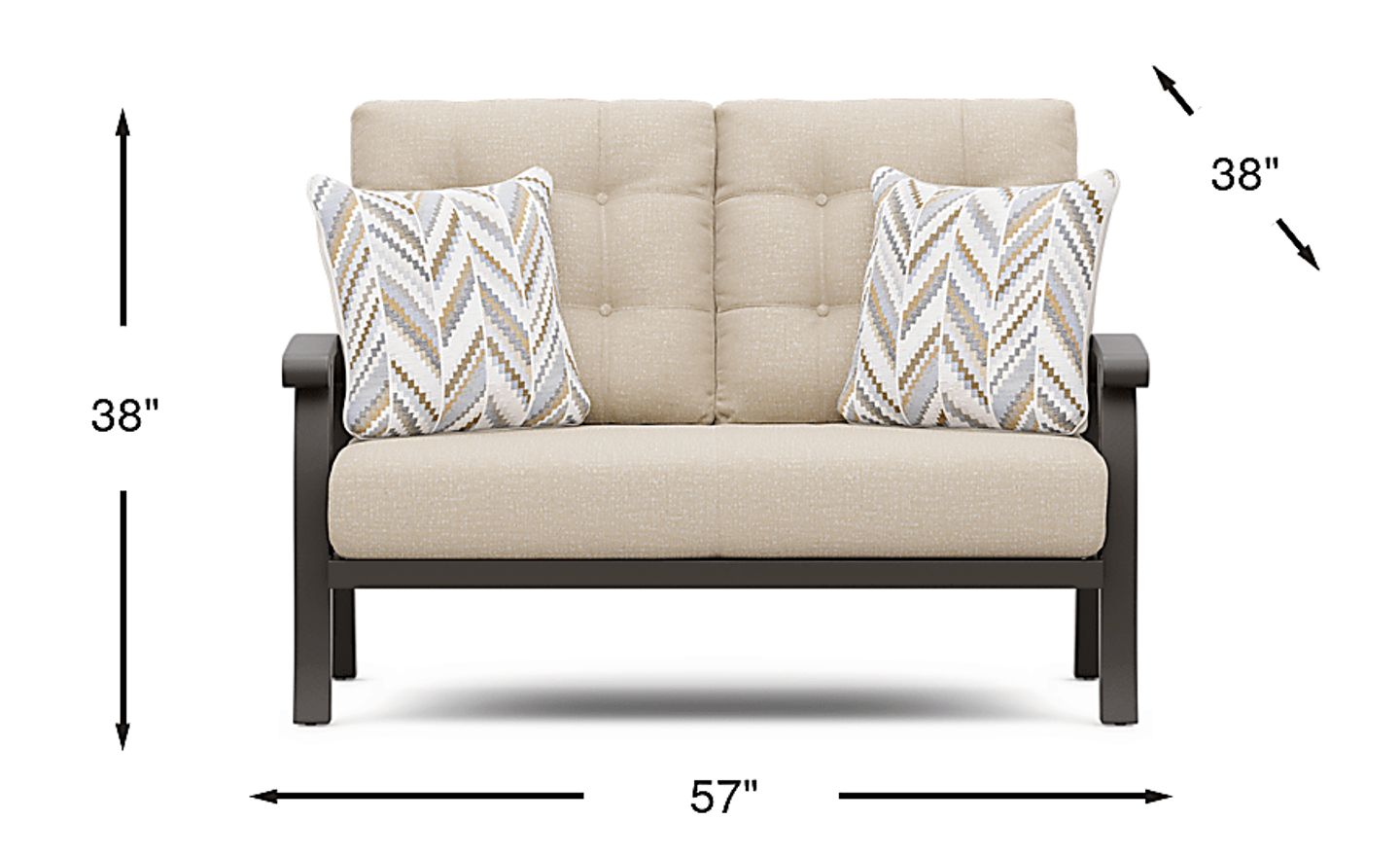 With a width of 57 inches, this loveseat is an excellent solution for urban outdoor spaces, such as balconies or small garden patios. It offers the comfort and seating capacity of a larger piece while maintaining a compact footprint. Its transitional design and "aged bronze" finish allow it to blend seamlessly into various architectural styles without overwhelming a smaller area.