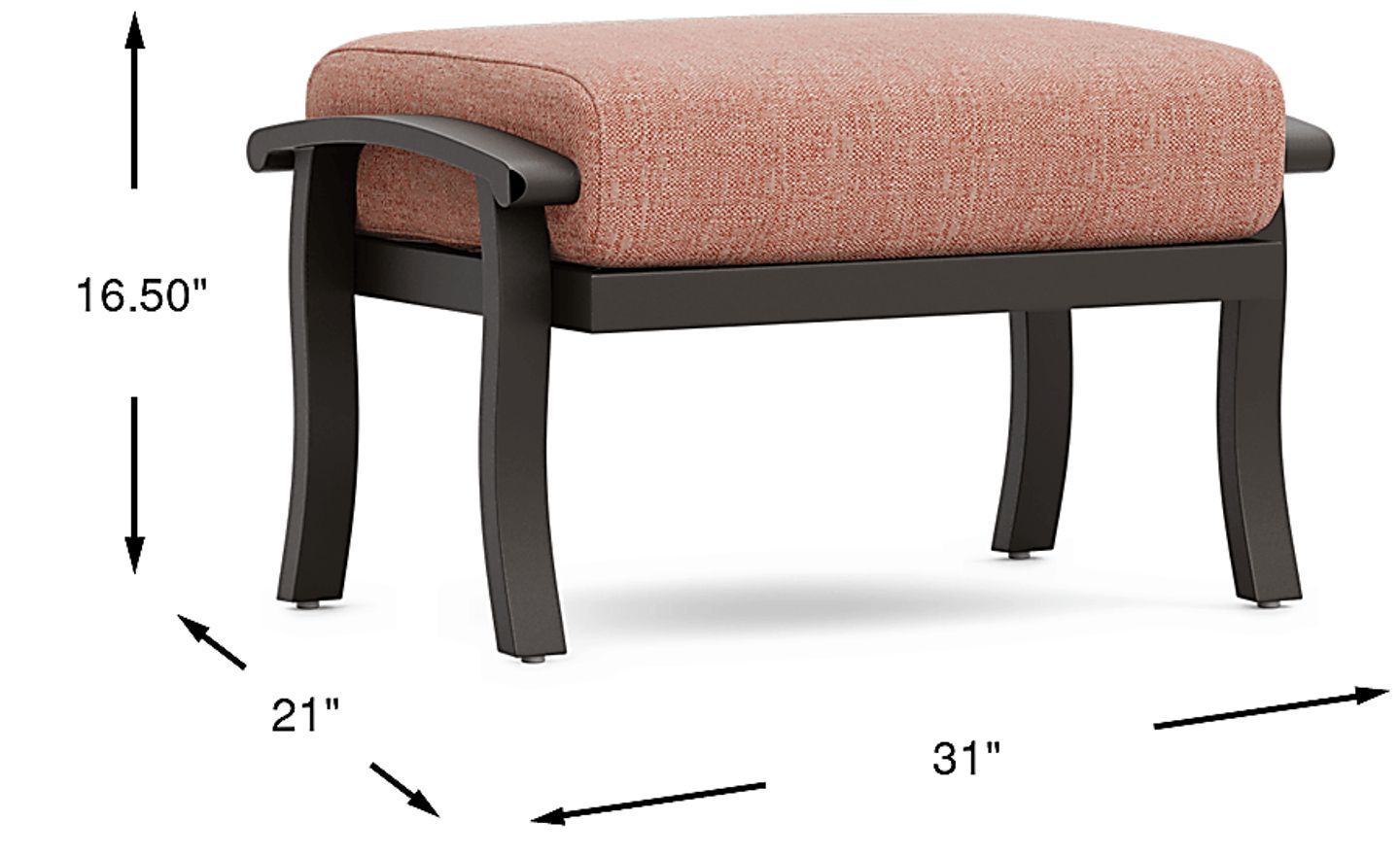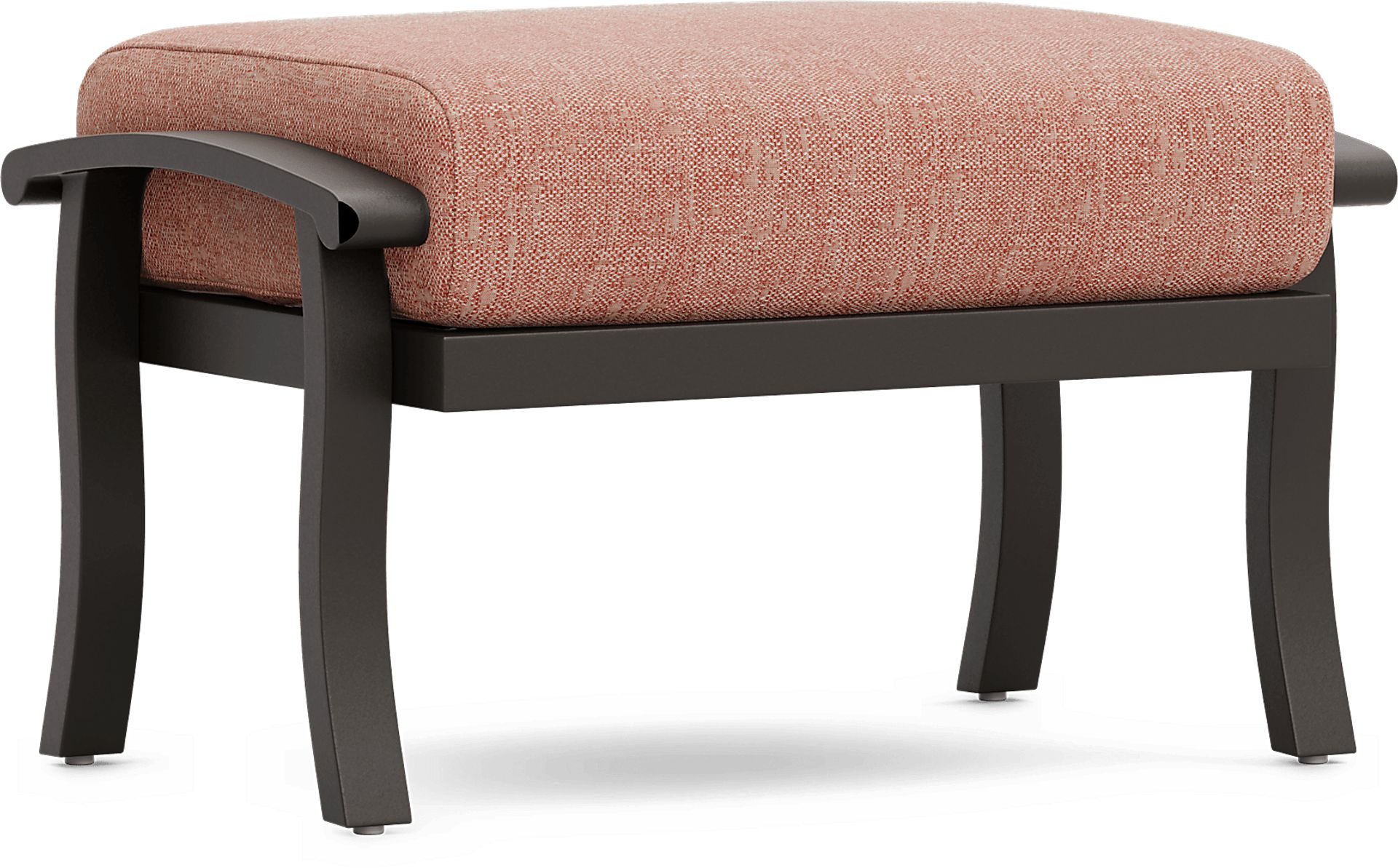 Take your style outside with the decorative and durable Lake Breeze collection. This ottoman features an aluminum frame in a rust resistant powder coat using a UV-protected top coat in an aged bronze finish. The terracotta colored Sunbrella cushion resists fading, mold and mildew for long-lasting durability and comfort. To clean Sunbrella fabric cushions remove dirt and spray on cleaning solution (water and mild soap), then use a soft bristle brush or sponge. Allow cleaning solution to soak into fabric and rinse thoroughly until soap residue is removed. Air dry. Do not dry clean.