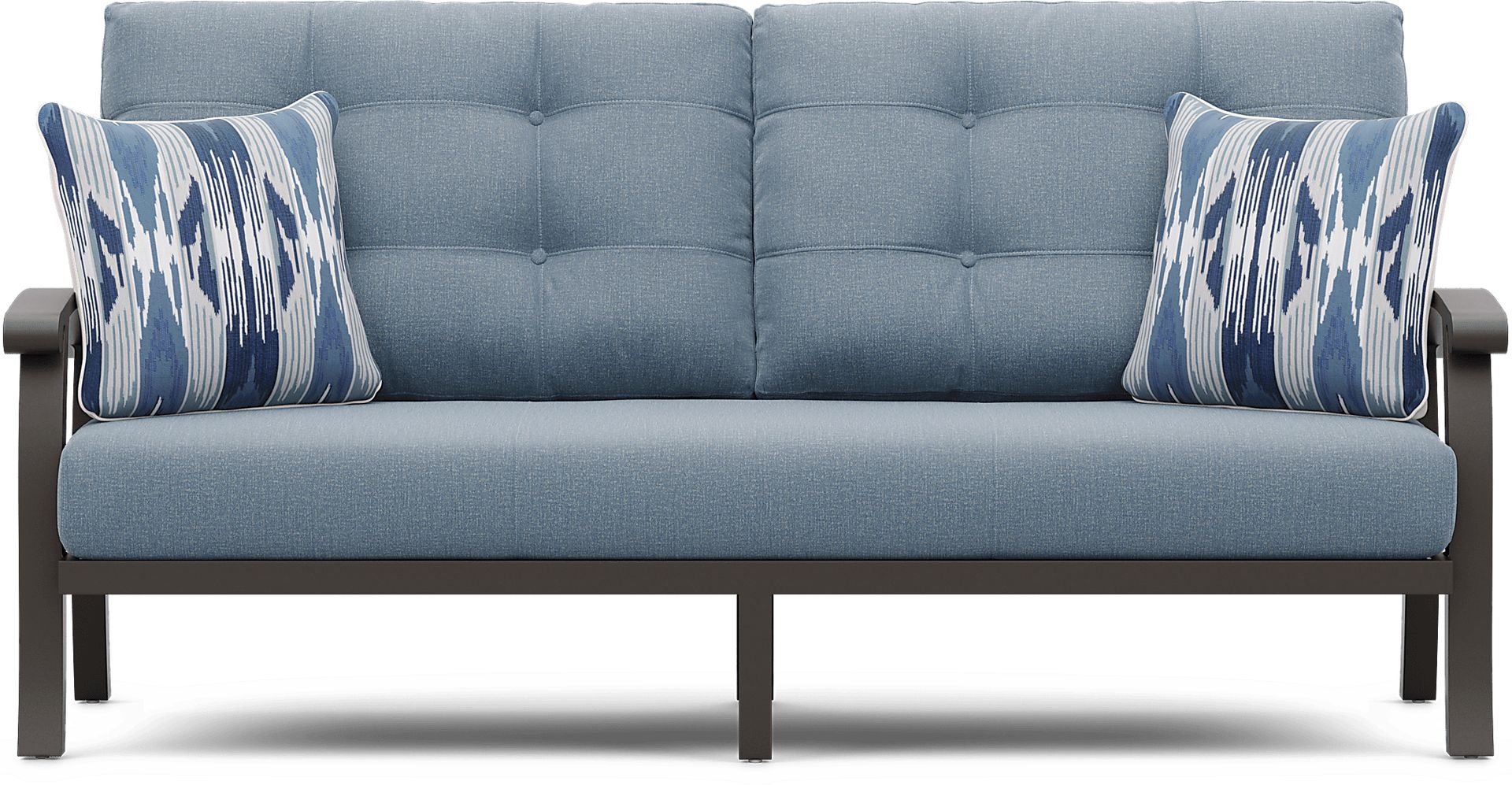 Take your style outside with the decorative and durable Lake Breeze sofa. This inviting piece features a slat back and is made with an aluminum frame in a rust resistant all-weather powder coat using a UV-protected top coat in an aged bronze finish. Blueberry colored outdoor fabric cushions resist fading and are mold and mildew resistant, creating long lasting and comfortable outdoor seating that can be enjoyed for many seasons. Decorative button tufting details on the back cushions add an appealing, tailored touch. Select cushion colors available in Sunbrella fabric