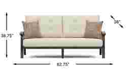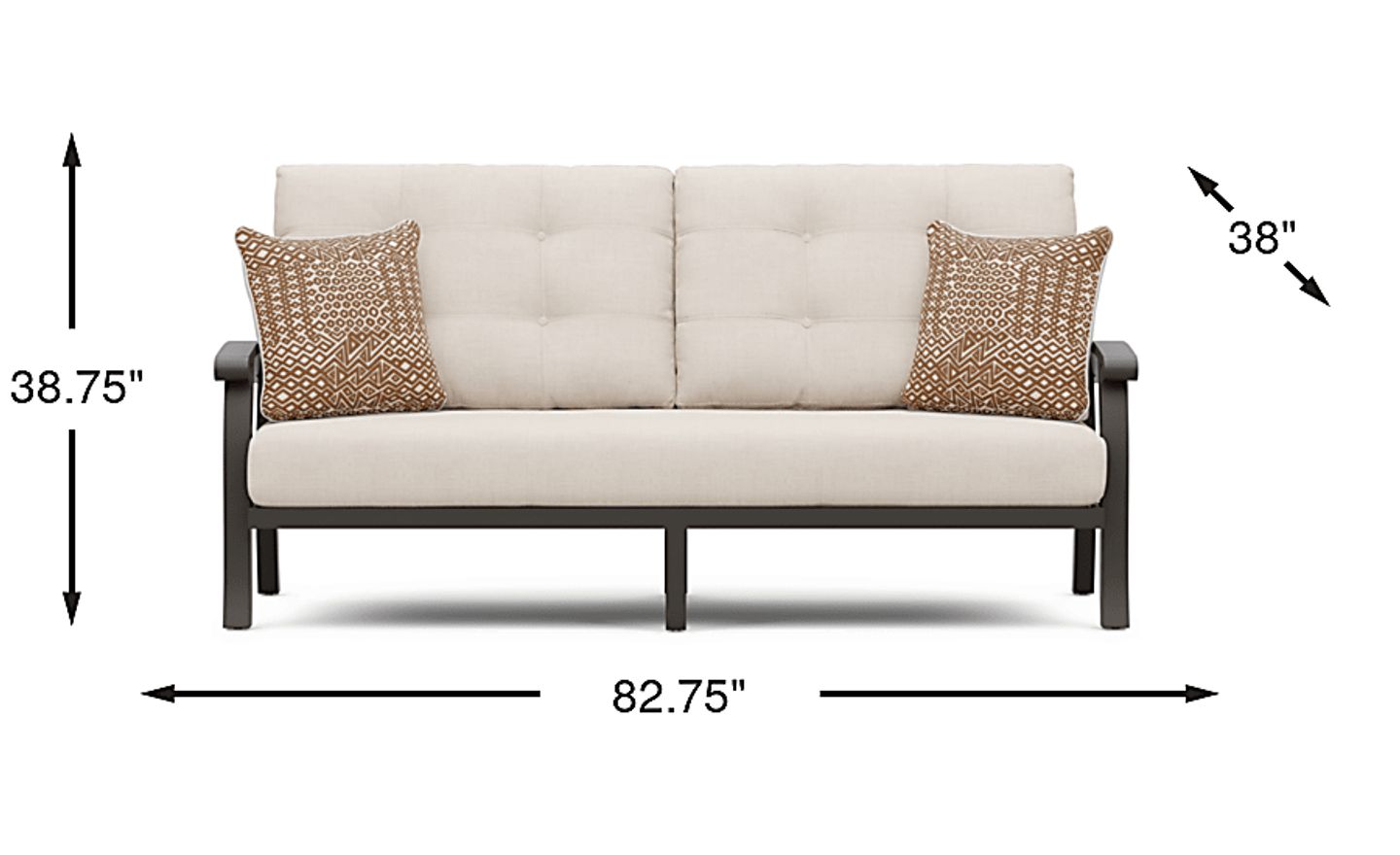 Take your style outside with the decorative and durable Lake Breeze sofa. This inviting piece features a slat back and is made with an aluminum frame in a rust resistant all-weather powder coat using a UV-protected top coat in an aged bronze finish. Parchment colored Sunbrella fabric cushions resist fading and are mold and mildew resistant, creating long lasting and comfortable outdoor seating that can be enjoyed for many seasons. Decorative button tufting details on the back cushions add an appealing, tailored touch. 100% Sunbrella fabric. To clean Sunbrella fabric cushions remove dirt and spray on cleaning solution (water and mild soap), then use a soft bristle brush or sponge. Allow cleaning solution to soak into fabric and rinse thoroughly until soap residue is removed. Air dry. Do not dry clean.