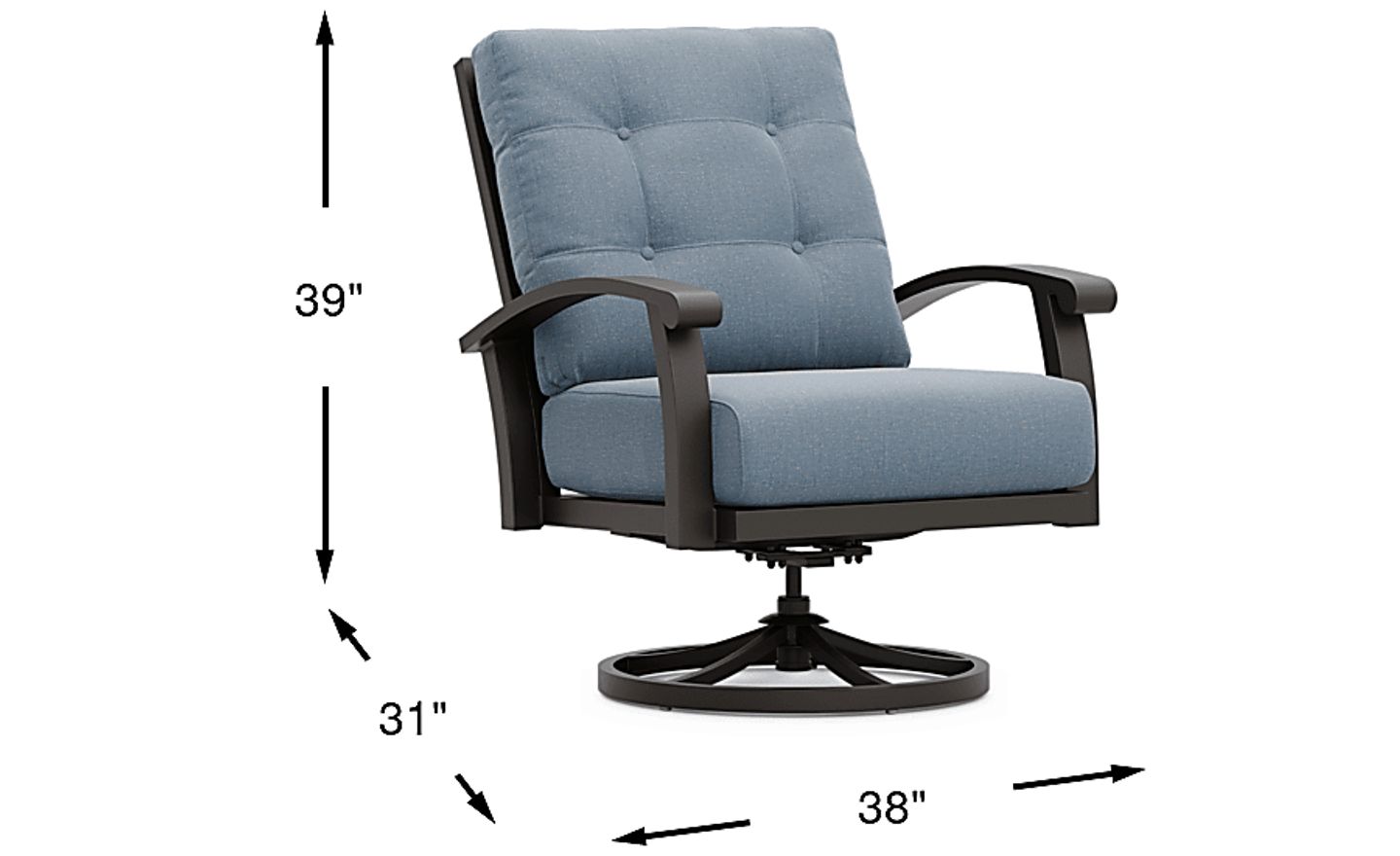 Take your style outside with the decorative and durable Lake Breeze collection. This relaxing swivel club chair is made with an aluminum frame in a rust resistant all-weather powder coat finish using a UV protected top coat in aged bronze. Outdoor cushions in a blueberry color are mold and mildew-resistant and colorfast. Thoughtful details include 360-degree movement, slat back styling, button tufted back cushions and French seaming on the seat cushion.