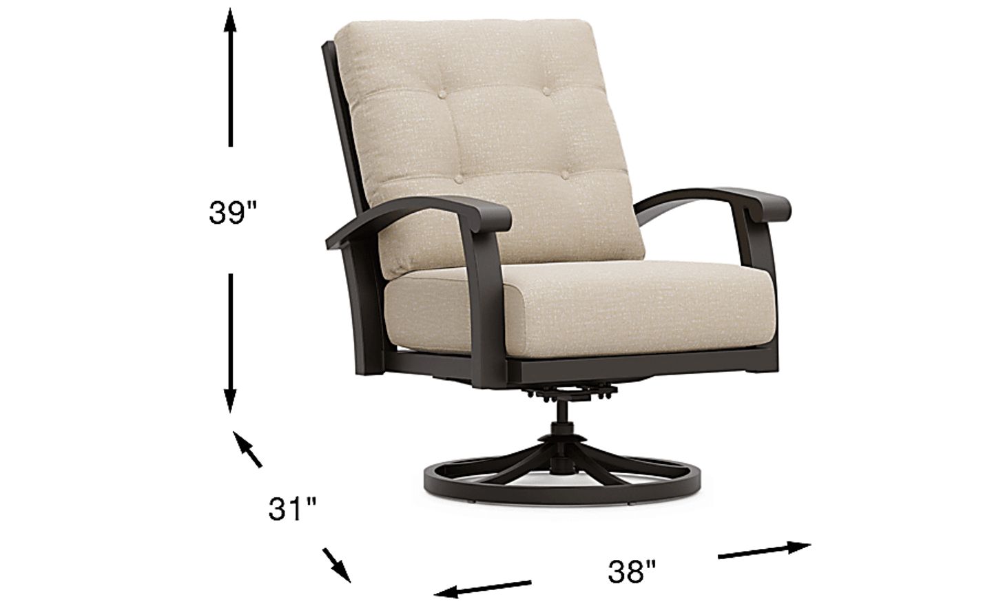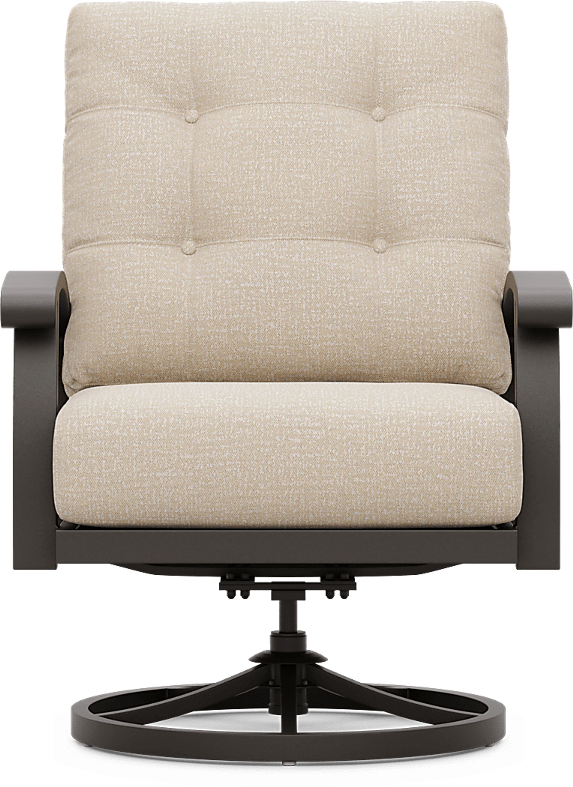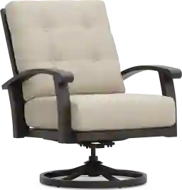 Take your style outside with the decorative and durable Lake Breeze collection. This relaxing swivel club chair is made with an aluminum frame in a rust resistant all-weather powder coat finish using a UV protected top coat in aged bronze. Outdoor cushions in a hemp color are mold and mildew-resistant and colorfast. Thoughtful details include 360-degree movement, slat back styling, button tufted back cushions and French seaming on the seat cushion.