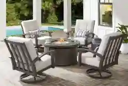 Complete your backyard entertaining area with the Lake Breeze swivel club chair. It's made with an aluminum frame in a rust resistant all-weather powder coat finish using a hand applied aged bronze finished UV protected top coat. Sunbrella performance fabric covered cushions, in a parchment color, are colorfast, mold and mildew resistant for durable outdoor use. Thoughtful details include swivel movement, slat back styling, button tufted back cushions and French seaming on the seat cushion. To clean Sunbrella fabric cushions remove dirt and spray on cleaning solution (water and mild soap), then use a soft bristle brush or sponge. Allow cleaning solution to soak into fabric and rinse thoroughly until soap residue is removed. Air dry. Do not dry clean.