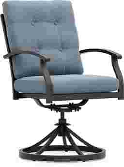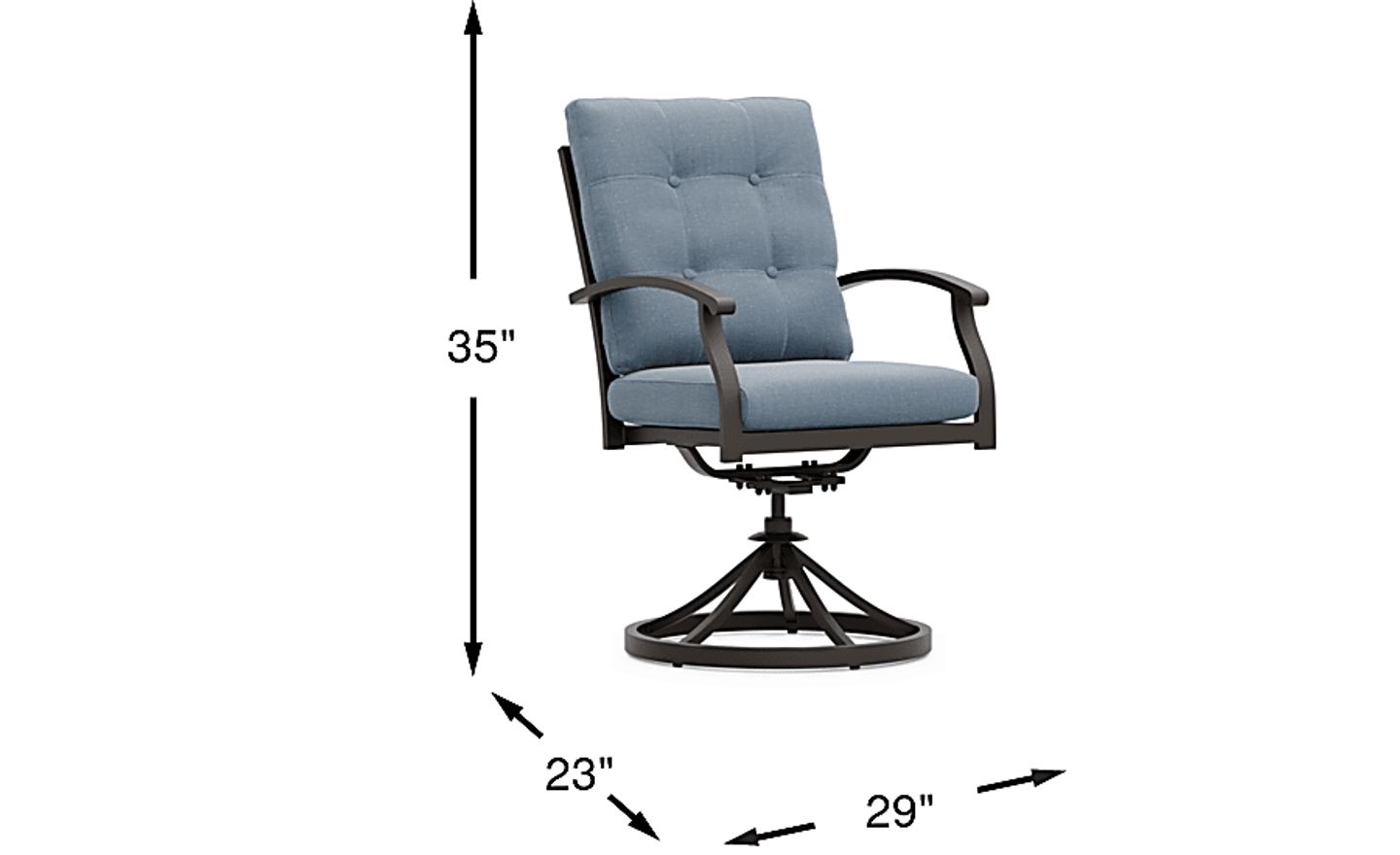 Complete your outdoor dining set with the Lake Breeze collection. This swivel dining chair is made with an aluminum frame in a rust resistant all-weather powder coat finish using a hand applied aged bronze finished UV protected top coat. Outdoor cushions in a blueberry hue are colorfast and mold and mildew resistant for durability. Appealing details include swivel motion, slat back styling, straight arms, button tufted back cushions and French seaming on the seat cushion.