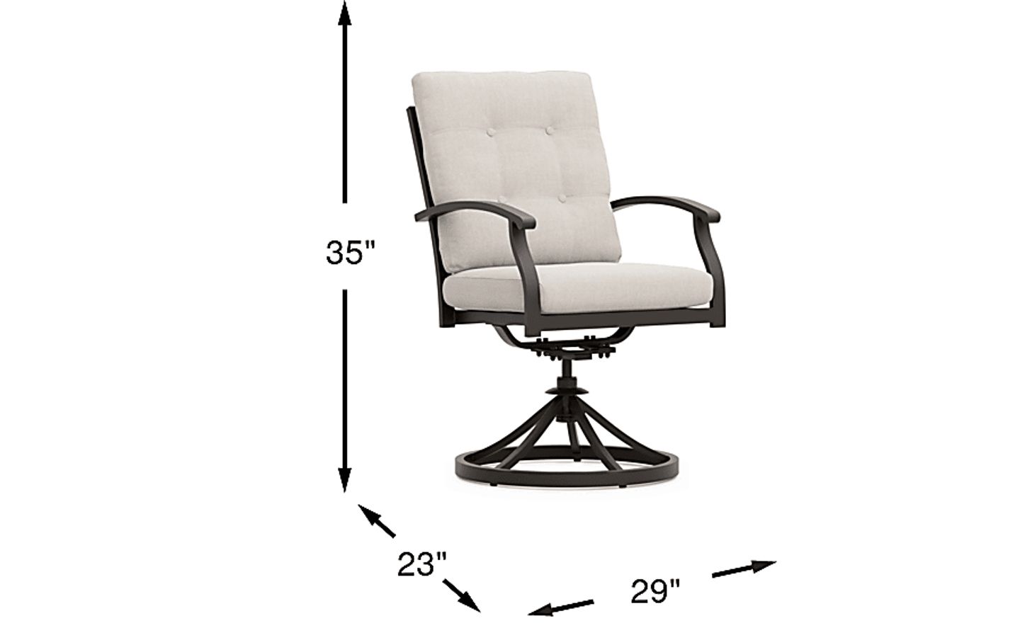Complete your outdoor dining set with the Lake Breeze collection. This swivel dining chair is made with an aluminum frame in a rust resistant all-weather powder coat finish using a hand applied aged bronze finished UV protected top coat. Outdoor cushions in a desert beige hue are colorfast and mold and mildew resistant for durability. Appealing details include swivel motion, slat back styling, straight arms, button tufted back cushions and French seaming on the seat cushion.