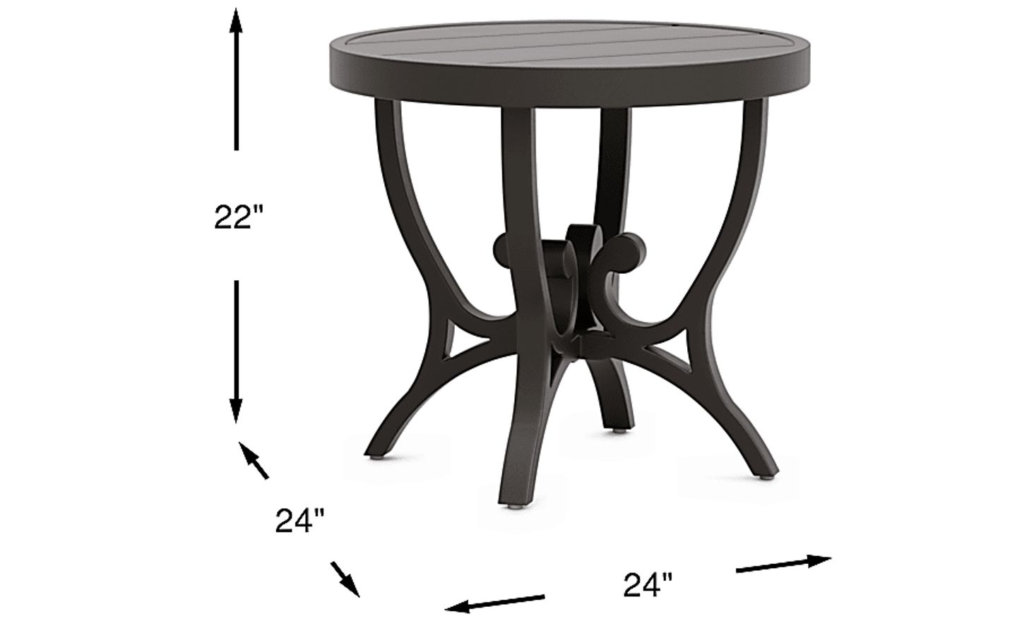 The ideal partner for your outdoor sofa, chair or chaise, the Lake Breeze end table is durable and decorative. The 24 inch round plank style top is supported by a decorative scrolled base while the aluminum frame is rendered in a decorator friendly aged bronze finish in a rust resistant all-weather powder coat finish using a UV protected top coat.