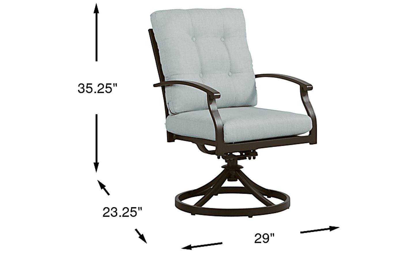 Complete your outdoor dining set with the Lake Breeze swivel dining chair. It's made with an aluminum frame in a rust resistant all-weather powder coat finish using a hand applied aged bronze finished UV protected top coat. Sunbrella performance fabric covered cushions, in a misty blue-gray tone, are colorfast, mold and mildew resistant for durable outdoor use. Appealing details include swivel movement, slat back styling, straight arms, button tufted back cushions and French seaming on the seat cushion. 100% Sunbrella fabric. To clean Sunbrella fabric cushions remove dirt and spray on cleaning solution (water and mild soap), then use a soft bristle brush or sponge. Allow cleaning solution to soak into fabric and rinse thoroughly until soap residue is removed. Air dry. Do not dry clean.