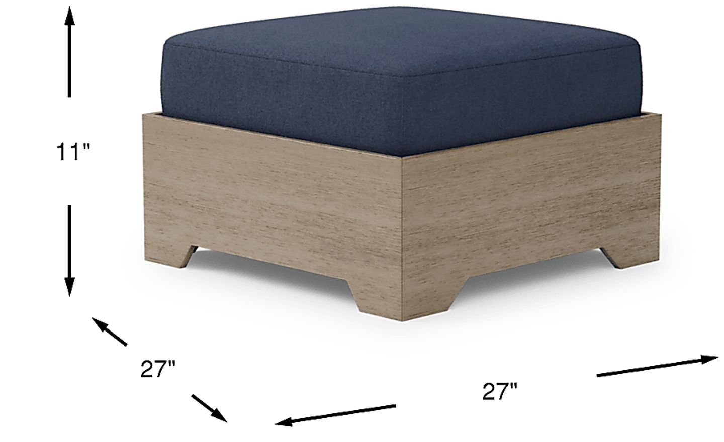 This ottoman is specifically engineered for durability in outdoor environments. The base is crafted from solid Eucalyptus, a dense hardwood naturally resistant to moisture, rot, and insect damage. For the cushion, we utilize 100% Sunbrella fabric, which is the industry standard for performance. It is UV-stabilized to prevent the deep indigo color from fading in the sun and is designed to repel water, ensuring the ottoman remains a staple of your patio for years to come.
