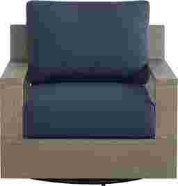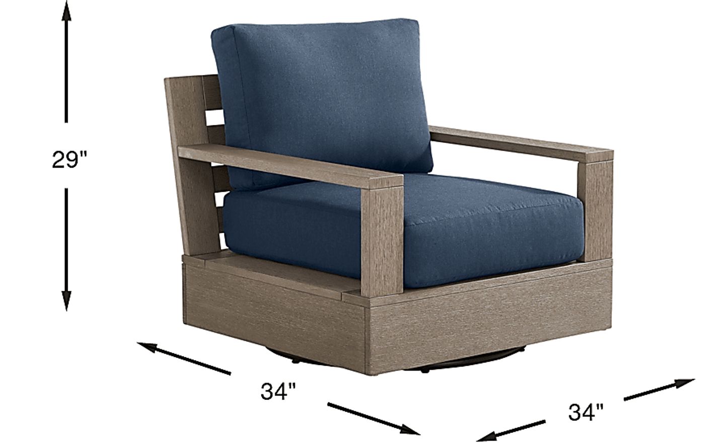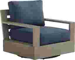 The Lake Tahoe swivel chair combines the durability of eucalyptus wood and outdoor performance Sunbrella cushions for a stylish outdoor seat with staying power. Contemporary lines and a slat back provide effortless style, while the indigo blue fabric complements the weathered wire brushed gray finish. A soothing swivel base is the perfect final touch, keeping you in the conversation at any angle.