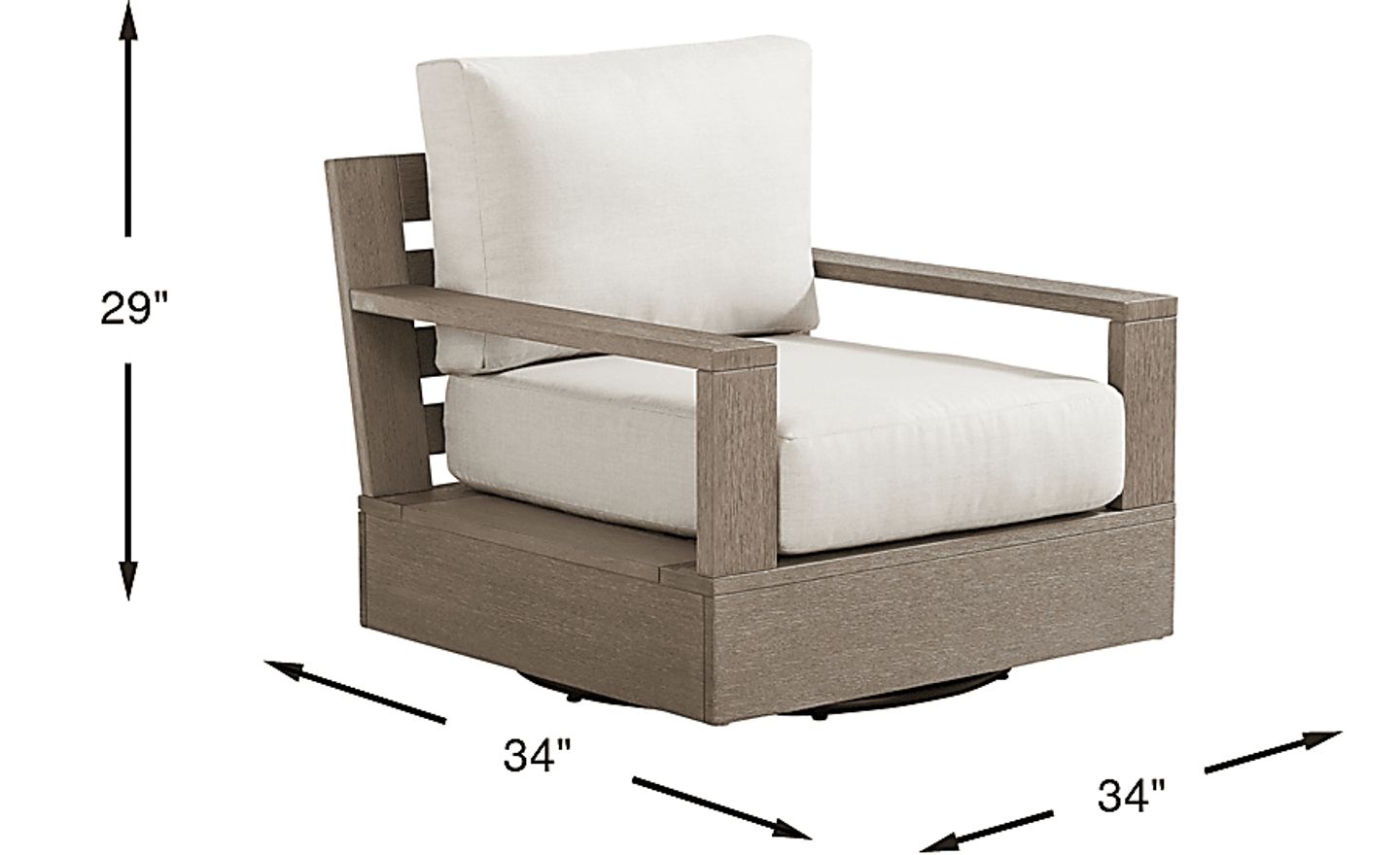 With a footprint of 34"W x 34"D, this chair provides a generous seating area without overwhelming limited outdoor spaces. The 360-degree swivel base is particularly advantageous for smaller balconies or urban patios; it allows you to easily rotate toward a view or a conversation partner without the need for extra clearance to move the furniture itself.