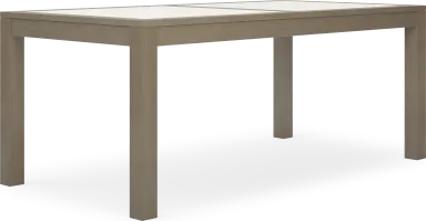 This dining table features two integrated stone inserts that provide a sophisticated, multi-textured look while offering a durable and resilient surface. These inserts beautifully complement the wire brushed gray wood, creating a refined aesthetic that balances organic warmth with the cool, modern feel of stone—ideal for an elevated outdoor dining experience.
