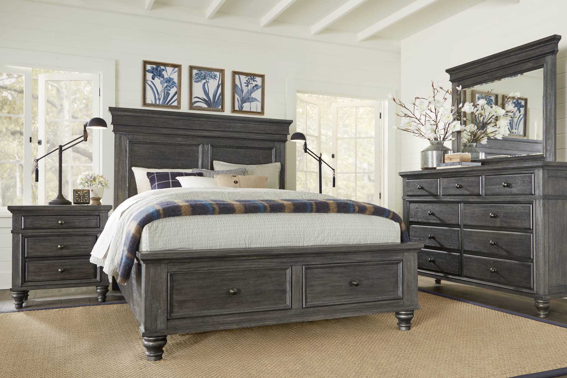 A stately addition to your home, the Lake Town storage bedroom features a high headboard and elegant picture frame moulding for a striking bed with subtle grandeur. Two storage drawers in the footboard extend its usefulness, providing a place to store extra linens or other items. The classic style makes it effortlessly blend into both contemporary and traditional rooms, depending on present decor. Crafted with pine solids and acacia veneers, a dark gray finish ensures its versatility throughout the years. Wire-brushing along the painted surface and round metal knob hardware adds a touch of charm to this warm, inviting collection. A dresser and mirror complete the room. Mattress and foundation (if required) sold separately.