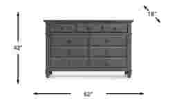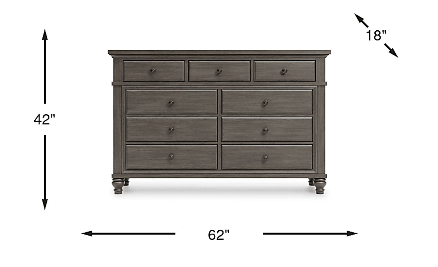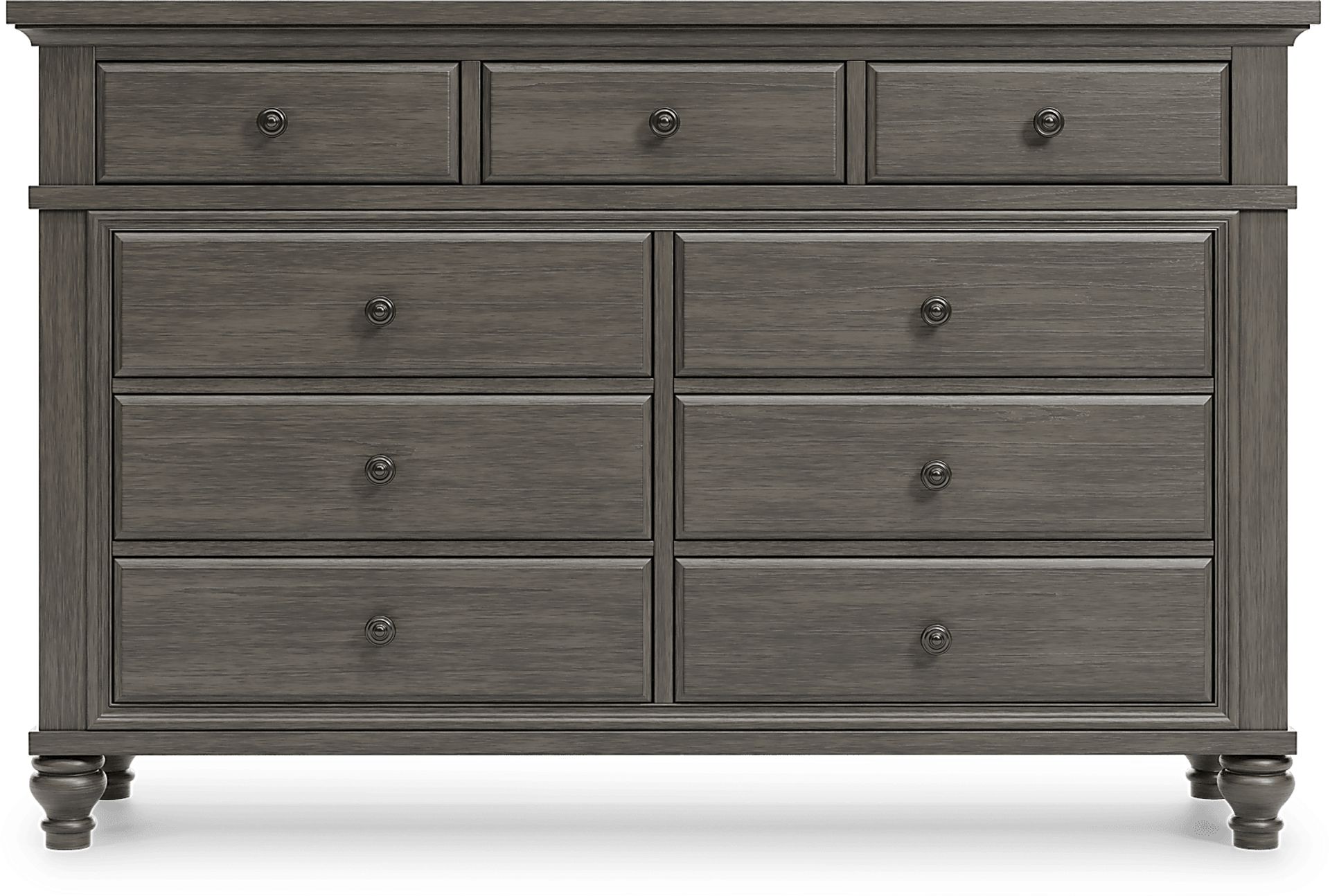Blending classic style and ample room, the Lake Town dresser makes the ideal place to store clothes. Crafted with poplar solids and acacia veneers, the classic dark gray finish ensures its seamless integration amongst any type of decor. Six sizable lower drawers and three smaller upper drawers are accented with dark metal knobs, adding a complementing tone to the wire-brushed finish.