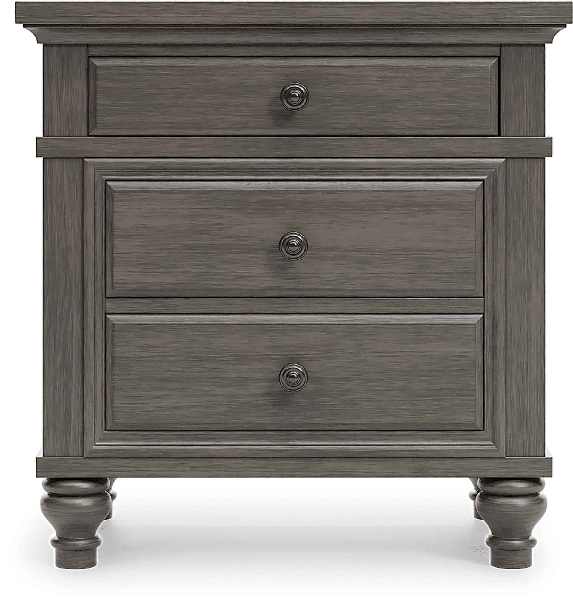 Providing just the right amount of storage at your bedside, the Lake Town nightstand has a casual transitional style that lends itself easily to your bedroom. Three drawers are accented with metal knob hardware, adding a delightful industrial touch against the dark gray finish. Crafted with acacia veneers, wire-brushed details add warmth.