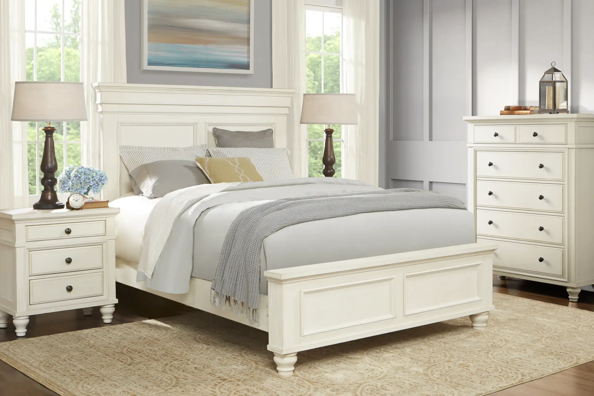 A stately addition to your home, the Lake Town collection features a high headboard and elegant picture frame moulding for a space-saving bedroom with subtle grandeur. The classic style makes it effortlessly blend into both contemporary and traditional rooms. Crafted with acacia veneers, an off-white finish ensures its versatility throughout the years. Wire-brushing along the painted surface and round metal knob hardware add a touch of charm to this warm, inviting collection. Perfect for home, apartment or condo. Mattress and foundation (if required) sold separately. Bed shown is queen size.