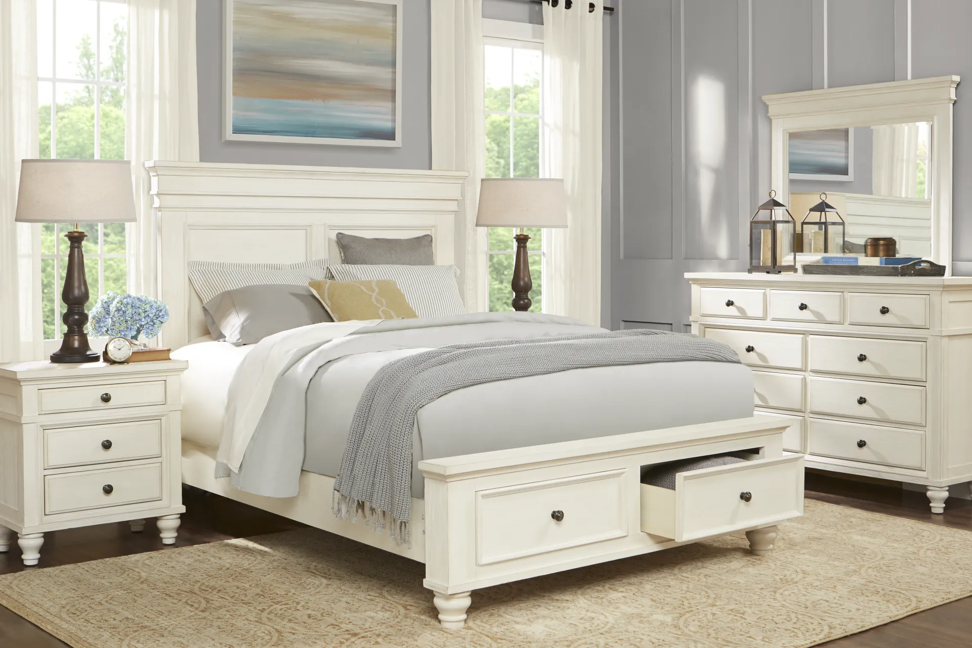 A stately addition to your home, the Lake Town storage bedroom features a high headboard and elegant picture frame moulding for a striking bed with subtle grandeur. Two storage drawers in the footboard extend its usefulness, providing a place to store extra linens or other items. The classic style makes it effortlessly blend into both contemporary and traditional rooms, depending on present decor. Crafted with acacia veneers, an off-white finish ensures its versatility throughout the years. Wire-brushing along the painted surface and round metal knob hardware adds a touch of charm to this warm, inviting collection. A dresser and mirror complete the room. Mattress and foundation (if required) sold separately.