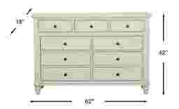 Blending classic style and ample room, the Lake Town dresser makes the ideal place to store clothes. Crafted with poplar solids and acacia veneers, the classic off-white finish ensures its seamless integration amongst any type of decor. Six sizable lower drawers and three smaller upper drawers are accented with dark metal knobs, adding a complementing tone to the wire-brushed finish.