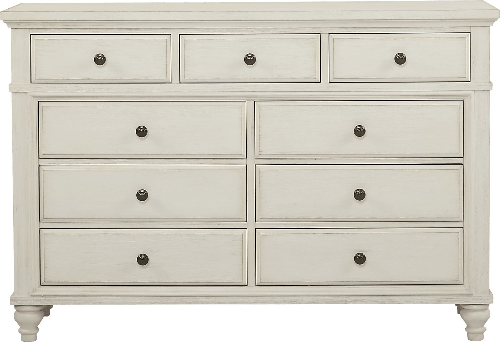 Blending classic style and ample room, the Lake Town dresser makes the ideal place to store clothes. Crafted with acacia veneers, the classic off-white finish ensures its seamless integration amongst any type of decor. Six sizable lower drawers and three smaller upper drawers are accented with dark metal knobs, adding a complementing tone to the wire-brushed finish.