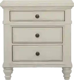 Providing just the right amount of storage at your bedside, the Lake Town nightstand has a casual transitional style that lends itself easily to your bedroom. Three drawers are accented with metal knob hardware, adding a delightful industrial touch against the off-white finish. Crafted with poplar solids and acacia veneers, wire-brushed details add warmth.