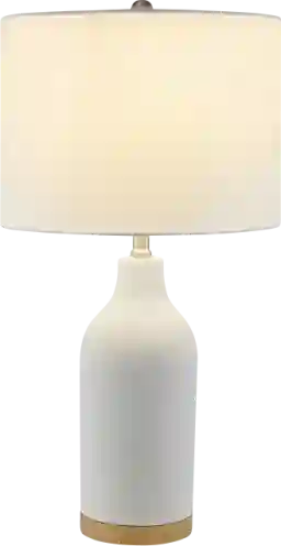 This lamp features an off-white fabric drum shade, which is ideal for creating a warm, inviting atmosphere. Unlike metal or glass shades that direct light in one direction, a fabric drum shade diffuses light evenly across the room. This creates a soft, ambient glow that reduces harsh shadows, making it perfect for a "cozy" living room setting or as a gentle light source for a bedroom.