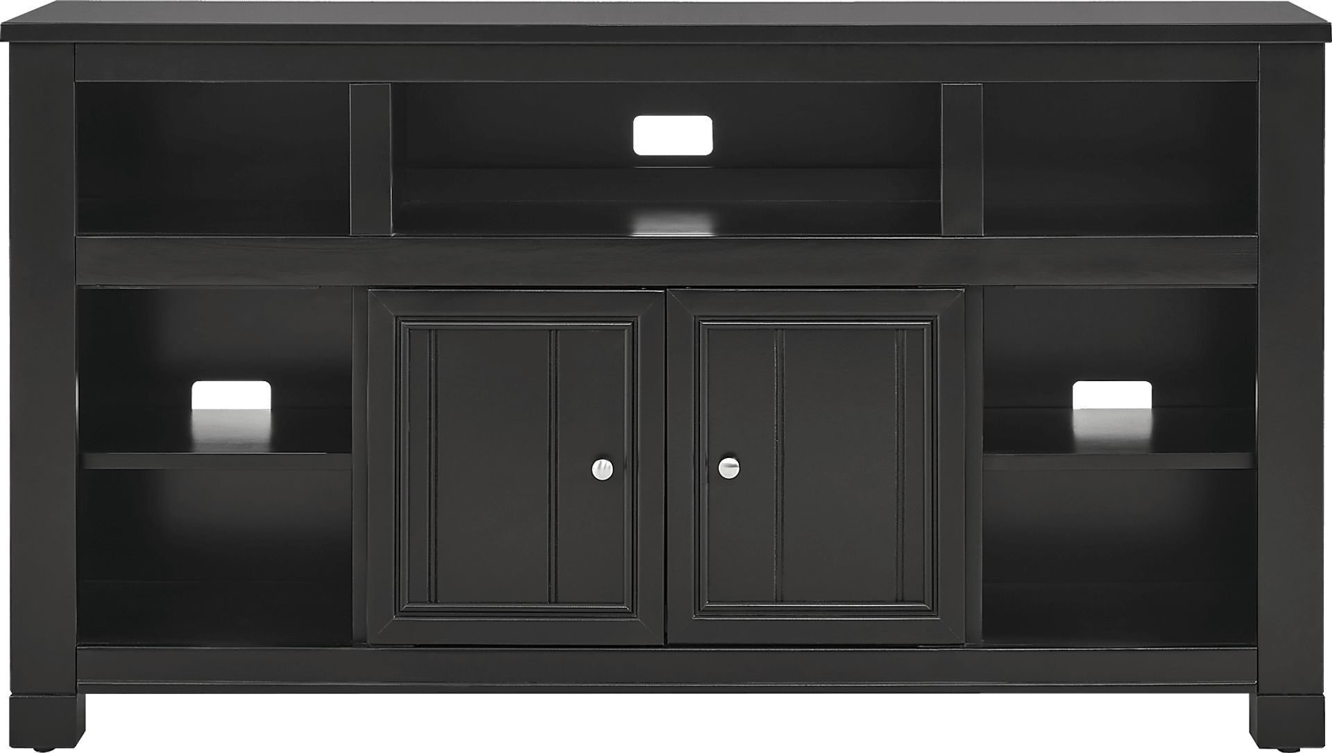 Welcoming energy and comfortingly familiar design come home with the Lakeside Cottage console's handsome lines and well-appointed storage capabilities. Finished in smooth black, this cottage style accent provides a subtle storage, decoration and home entertainment solution in one with seven open shelves for display and organization. Wire passthroughs on the back panel allow for tidy connections to game consoles, audio equipment and streaming devices. A two-door cabinet features metal pull hardware and accented doors, which can flip to close on either the inner or outer shelves.