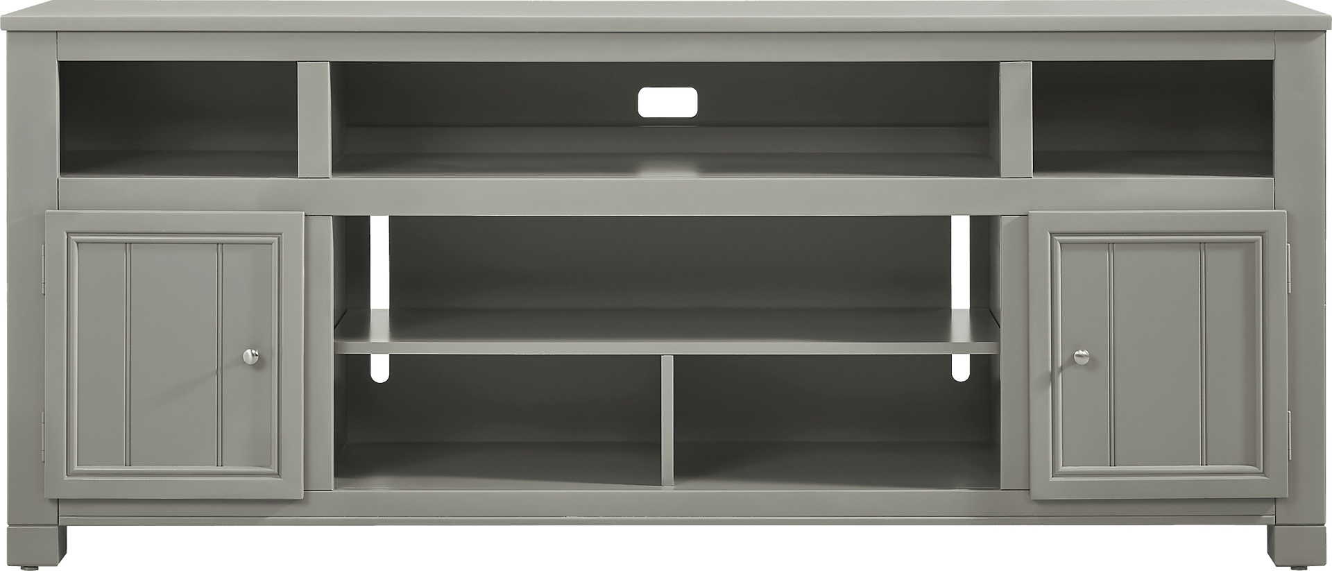 Welcoming energy and comfortingly familiar design come home with the Lakeside Cottage console's handsome lines and well-appointed storage capabilities. Finished in smooth gray, this cottage style accent provides a subtle storage, decoration and home entertainment solution in one with six open shelves for display and organization. Wire passthroughs on the back panel allow for tidy connections to game consoles, audio equipment and streaming devices. Cabinets on either side feature metal pull hardware and accented doors, opening onto two storage shelves each.