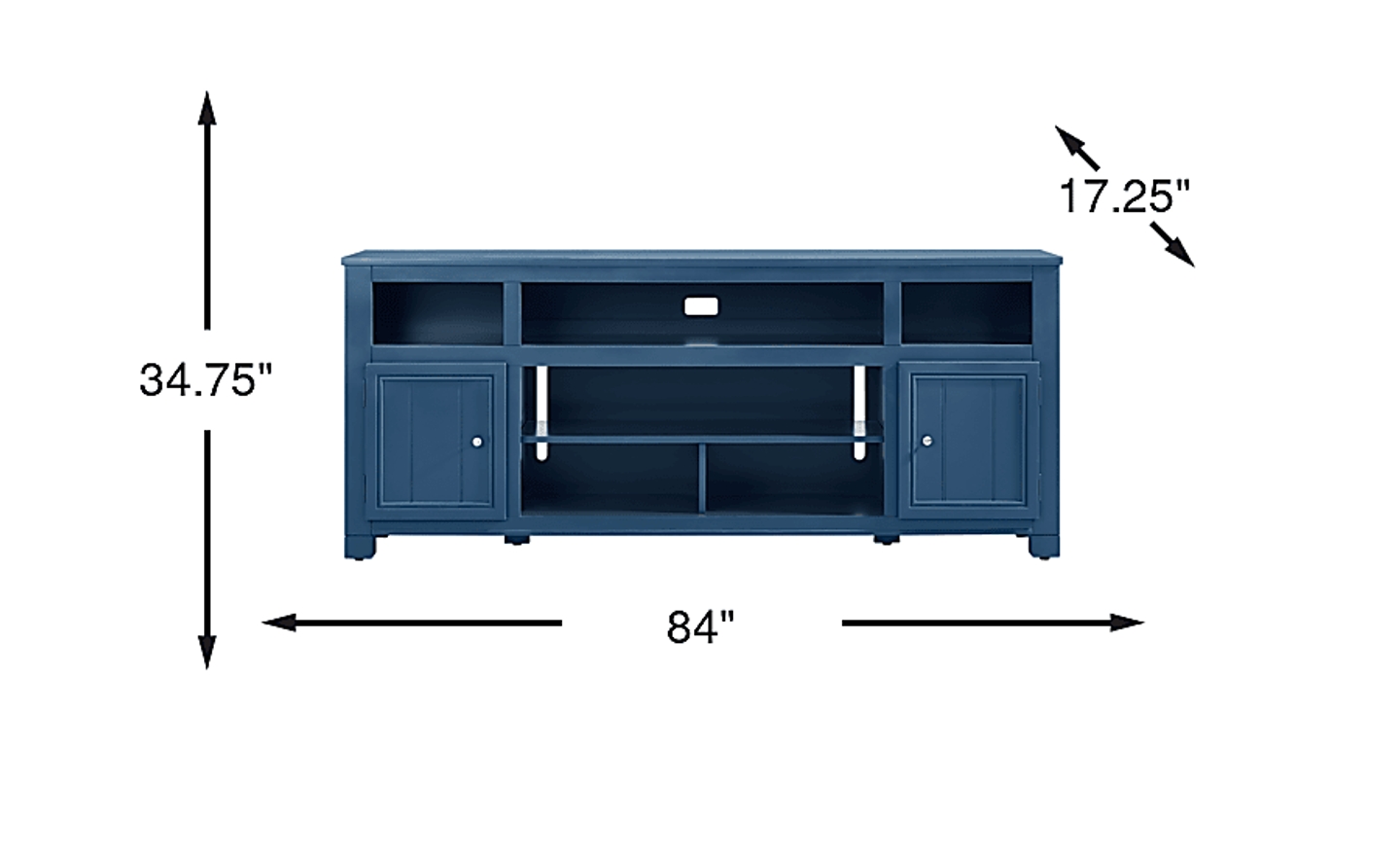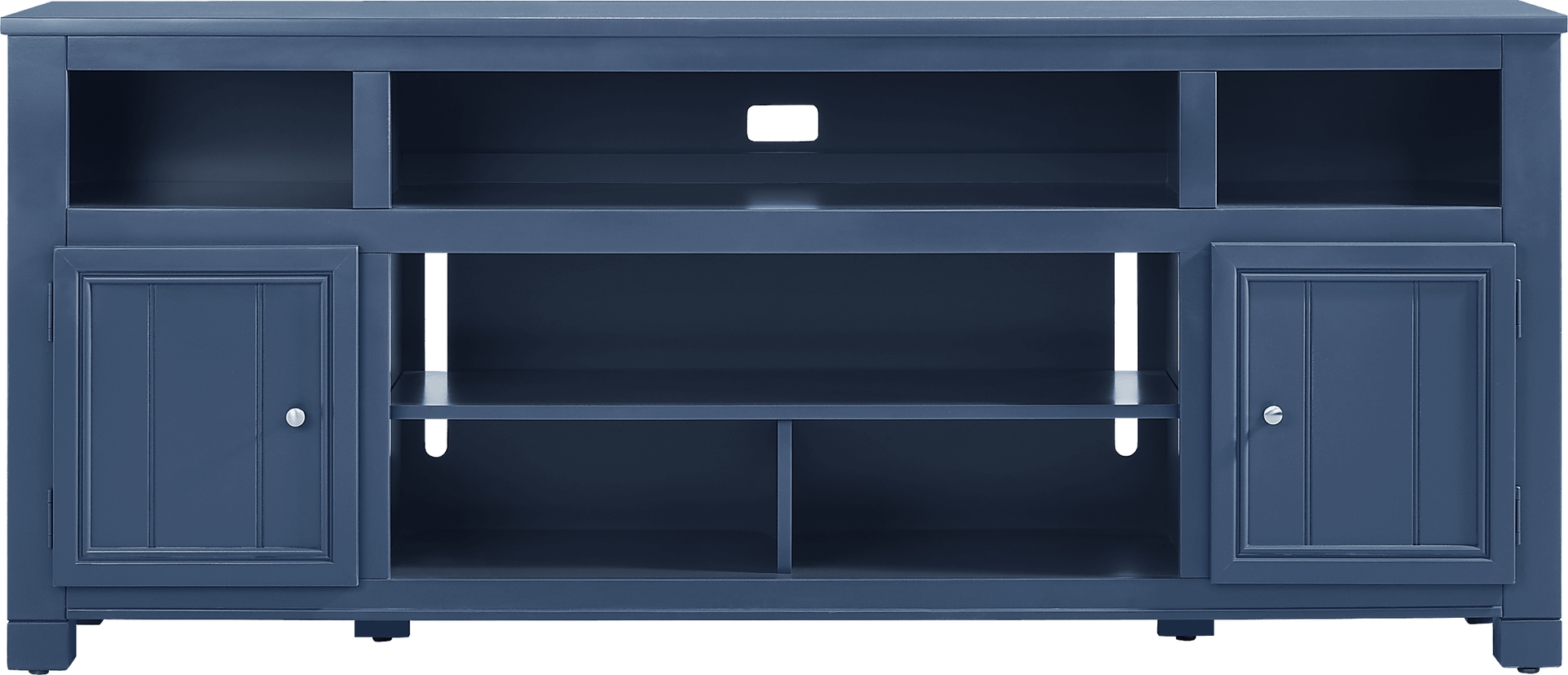 Welcoming energy and comfortingly familiar design come home with the Lakeside Cottage console's handsome lines and well-appointed storage capabilities. Finished in smooth navy, this cottage style accent provides a subtle storage, decoration and home entertainment solution in one with six open shelves for display and organization. Wire passthroughs on the back panel allow for tidy connections to game consoles, audio equipment and streaming devices. Cabinets on either side feature metal pull hardware and accented doors, opening onto two storage shelves each.