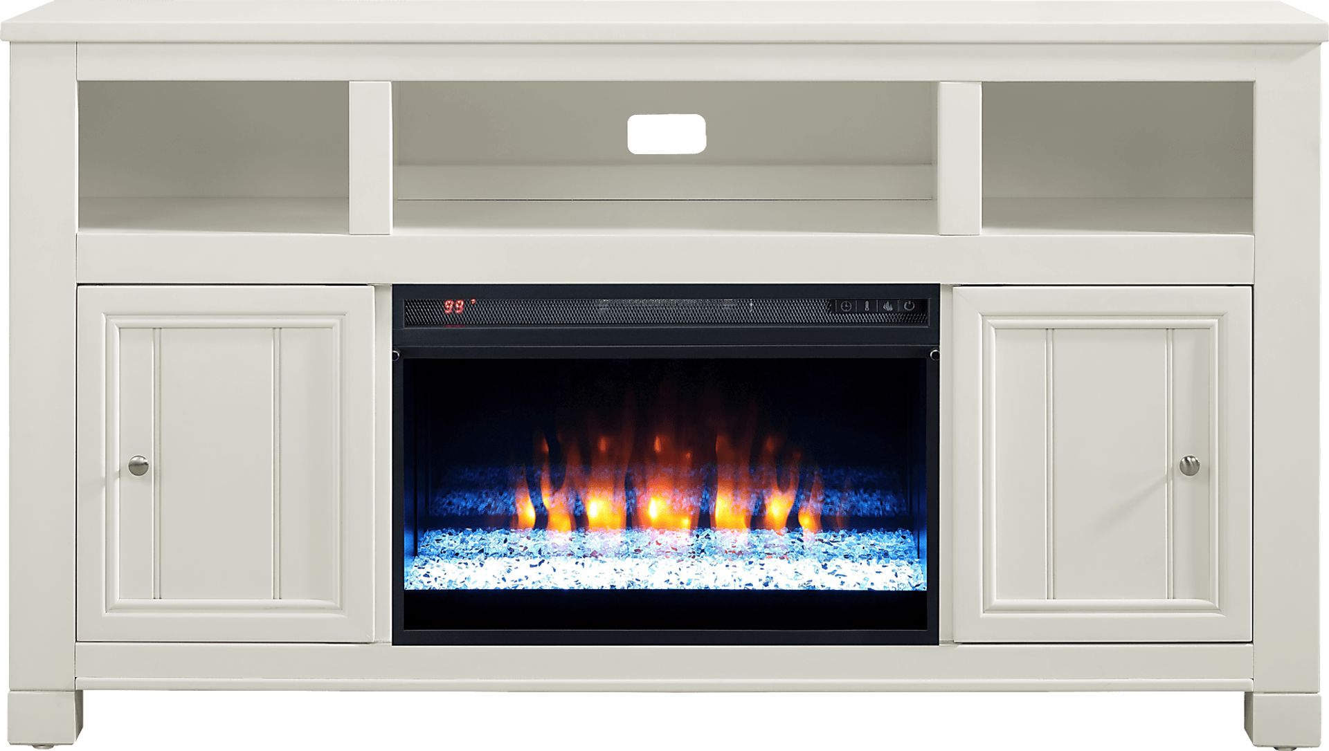 Welcoming energy and comfortingly familiar design come home with the Lakeside Cottage console's handsome lines and well-appointed storage capabilities. Finished in smooth white, this cottage style accent provides a subtle storage, decoration and home entertainment solution in one with seven open shelves for display and organization. Wire passthroughs on the back panel allow for tidy connections to game consoles, audio equipment and streaming devices. Cabinets on either side feature metal pull hardware and accented doors, opening onto two storage shelves each. The removable fireplace portion features a realistic energy-saving LED firebox with remote controlled heat and ambient lighting with four color changing options. LED color effects can be used with or without heat.