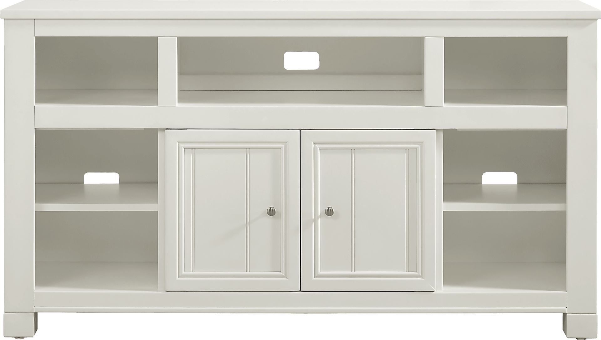 Welcoming energy and comfortingly familiar design come home with the Lakeside Cottage console's handsome lines and well-appointed storage capabilities. Finished in smooth white, this cottage style accent provides a subtle storage, decoration and home entertainment solution in one with three shelves divided into seven cubbies for display and organization. Wire passthroughs on the back panel allow for tidy connections to game consoles, audio equipment and streaming devices. A two-door cabinet features metal pull hardware and accented doors, which can flip to close on either the inner or outer shelves.