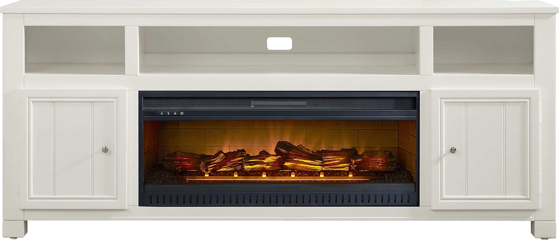 Welcoming energy and comfortingly familiar design come home with the Lakeside Cottage console's handsome lines and well-appointed storage capabilities. Finished in smooth white, this cottage style accent provides a subtle storage, decoration and home entertainment solution in one with six open shelves for display and organization. Wire passthroughs on the back panel allow for tidy connections to game consoles, audio equipment and streaming devices. Cabinets on either side feature metal pull hardware and accented doors, opening onto two storage shelves each. The electric fireplace features innovative flame effects on bricks and logs for added depth and 3D realism. A convenient remote control adjusts the flame and glow levels and includes a built-in timer (from 30 minutes to 60 hours). The adjustable thermostat ranges from 62 degrees to 82 degrees.