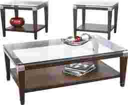 A rectangular glass top and lower display shelf with beautiful veneers makes the Laketon cocktail table an attractive and functional addition to your room. Silver finished metal accents add a lovely contemporary touch. The Laketon end table is a delightful piece. Its glass top, clean lines and a convenient shelf below provide eye appeal and functionality. Consumer assembly required.