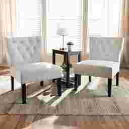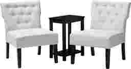 Create an elegant and comfortable conversation space in your home with the Lamond chair and table set. The Lamond set includes a pair of two solid rubberwood chairs that showcase a sleek black finish. Each chair is upholstered in a classic neutral polyester fabric and padded with foam for the utmost comfort. Button tufting on the back of the chairs adds a touch of luxury. A black-finished wood end table completes the set. This elegant set is suitable for both a living room or foyer space. Customer assembly is required. Customer assembly is required.