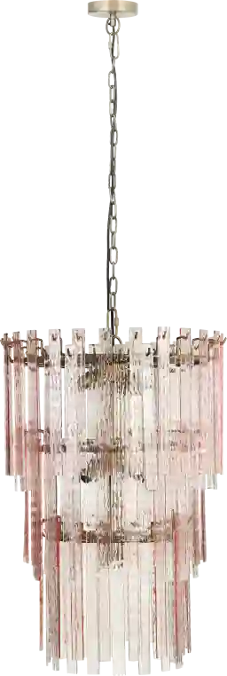 The Lamont Summit chandelier is a stunning and sophisticated lighting fixture, reminiscent of classic Murano glass chandeliers. The chandelier's warm and soft lighting creates a cozy and inviting atmosphere, while the pink glass sparkles and reflects light around the room. Add the Hampshire to your home for that element of va-va-voom Professional installation by an electrician is recommended.
