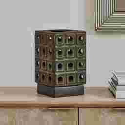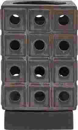 This sculptural earthenware Lamro candle holder features a unique design with a modern, architectural design, finished with a distressed brown glaze, revealing rich, dark bronze undertones for added depth. Safe for outdoor use, but protection from freezing temperatures is recommended.