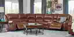 Luxuriously plush and classically stylish, the Lancaster Heights sectional comfortably seats up to five adults, making it ideal for entertaining a crowd. Supple brown leather upholstery is tastefully accented with contrasting stitching detail for a warm, traditional look. Padded rolled arms, bucket seating and chaise style reclining footrests on each end seat create an indulgently plush seating experience, with the added convenience of a console featuring two cupholders and a lift-top storage space. Top Grain Leather Where the Body Touches and Vinyl Sides and Backs.