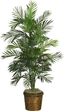 This specific silk palm is designed strictly for indoor use. The silk leaves and wicker basket are not treated with UV inhibitors or waterproof coatings, meaning prolonged exposure to direct sunlight or moisture could cause the colors to fade and the materials to deteriorate. For the best longevity, keep this piece in a climate-controlled indoor environment.