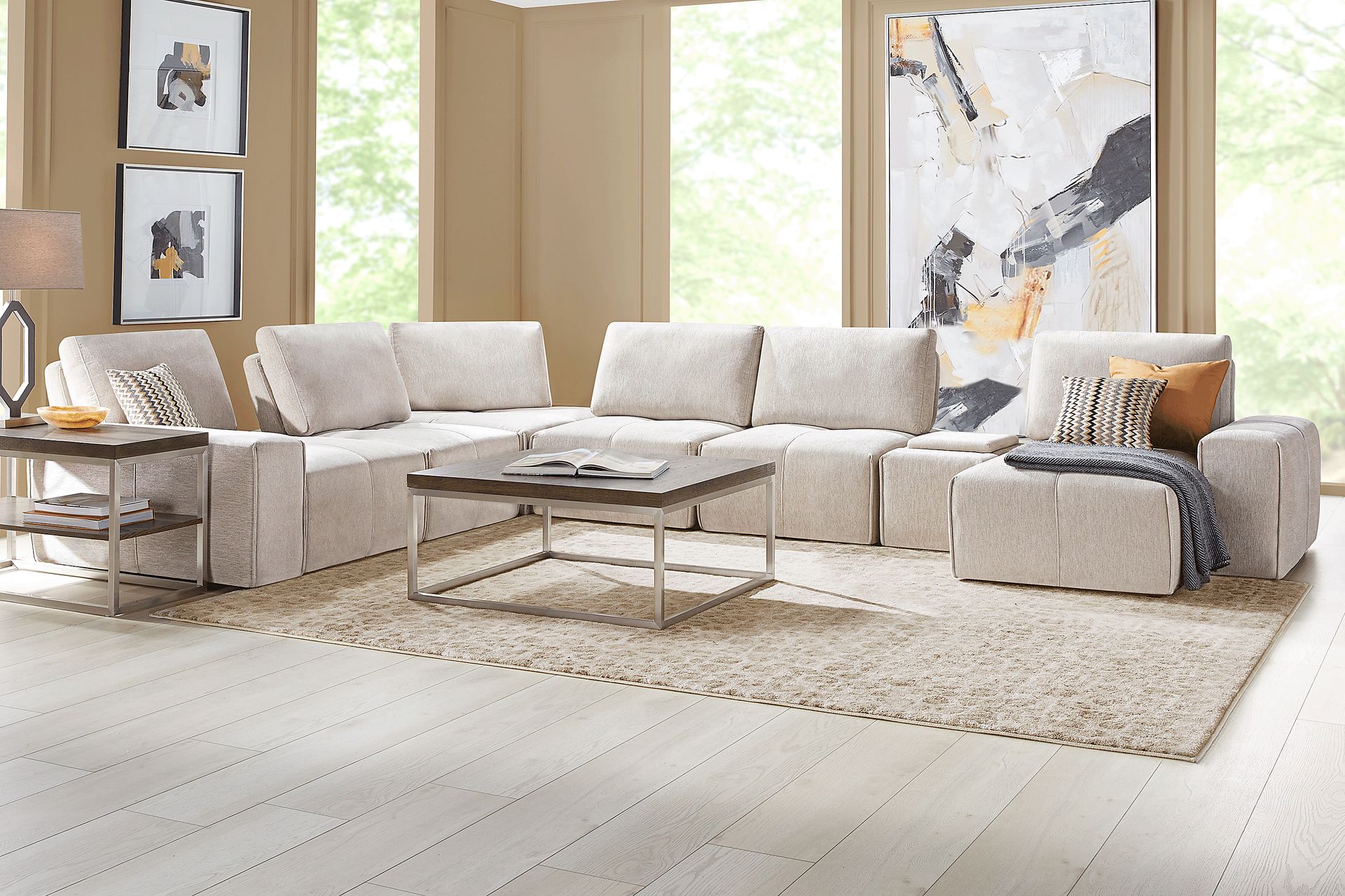 Luxurious versatility and a bold, confident style give the Laney modular sectional its one-of-a-kind charming sophistication. This collection features individual seats and pieces that can be combined and rearranged into exactly the configuration you need. Upholstered on all sides in a soft beige chenille, the oversized seats of this modular sectional offer dual-position backs for adjustable seat depth. Clean, tailored lines and tufting details keep the whole look cohesive no matter how the sectional is arranged. USB ports, a pair of three-prong outlets, and a Bluetooth speaker are all conveniently built into the set's storage console. Upholstery: 100% Polyester.