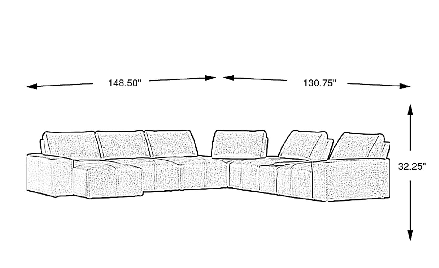 This is a substantial furniture piece with a footprint of approximately 148.5 inches in width and 134.5 inches in depth. We recommend measuring your space carefully, ensuring you have enough clearance for walkways and additional furniture like coffee tables. Because it is a modular system, it is particularly well-suited for spacious, open-concept living rooms or large basement media centers where you want to maximize seating capacity.